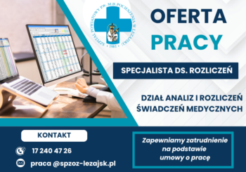 Samodzielny Publiczny Zespół Opieki Zdrowotnej w Leżajsku zatrudni specjalistę do spraw rozliczeń w Dziale Analiz i Rozliczeń Świadczeń Medycznych. Zakres obowiązków: analiza dokumentacji medycznej i weryfikacja...