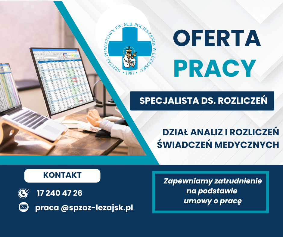 Samodzielny Publiczny Zespół Opieki Zdrowotnej w Leżajsku zatrudni specjalistę do spraw rozliczeń w Dziale Analiz i Rozliczeń Świadczeń Medycznych.