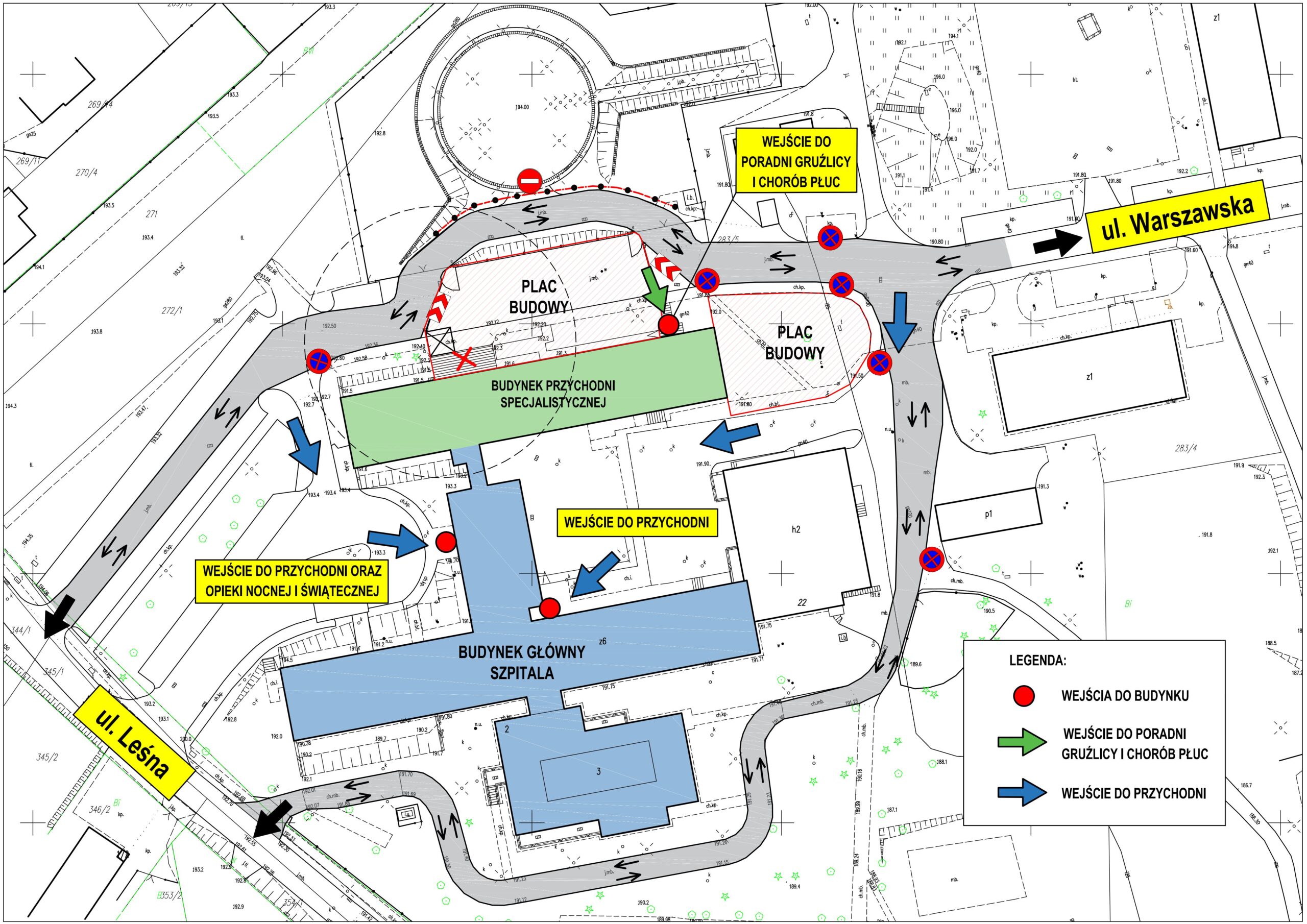 Od poniedziałku 3 listopada, do odwołania nastąpi zmiana organizacji ruchu na terenie szpitala. Zamknięta będzie droga wzdłuż wejścia do Przychodni Specjalistycznej. Prosimy o korzystanie z wyznaczonego objazdu.