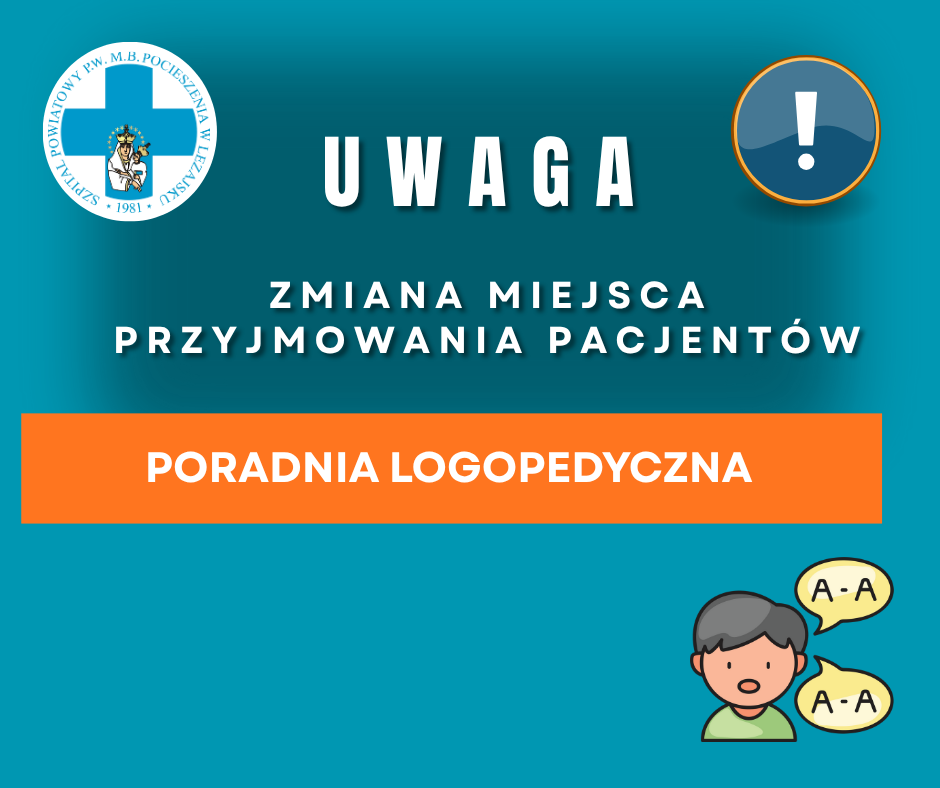 W związku z nadbudową piętra Przychodni Specjalistycznej, związaną z budową Zakładu Opiekuńczo-Leczniczego, tymczasowo zmianie ulegają miejsca przyjmowania pacjentów Poradni Logopedycznej.